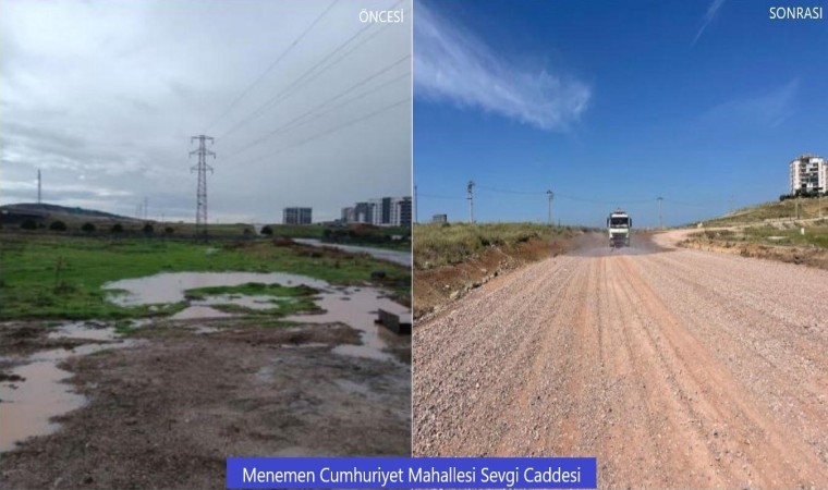 Eş zamanlı yürütülen bir diğer yol çalışması ise Menemen’de. İstiklal Mahallesi 5. Cadde ile 7440 Sokak arasında 25 metre genişliğinde 350 metre uzunluğunda ulaşım yolu açılıyor. Sevgi Caddesi’ndeki 20 metre genişliğinde 700 metre uzunluğundaki yol çalışmasının yüzde 85’i ise tamamlandı. Özellikle yeni yerleşim yerlerinin ağırlıkta olduğu noktada ulaşımı kolaylaştırmak için yapılan yollar Menemen halkına nefes aldıracak.