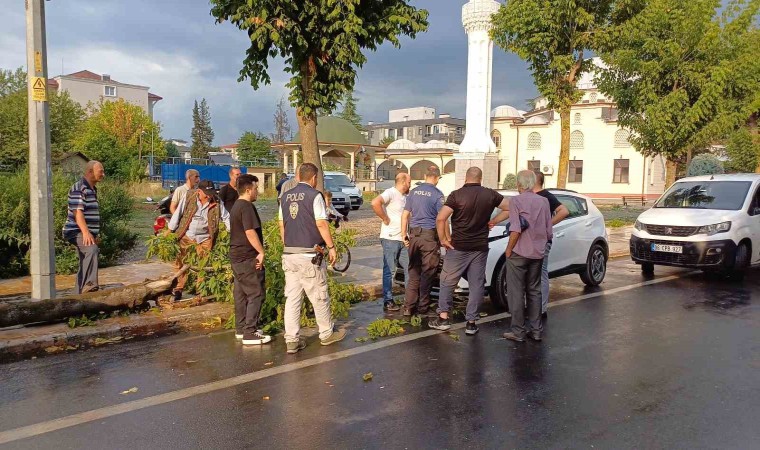 Düzce’de kökünden sökülen ağaç, park halindeki bir aracın üzerine devrildi. Araç sahibi, aracını 10 gün önce aldığını ve daha kullanamadan devrilen ağacın azizliğine uğradığını söyledi.