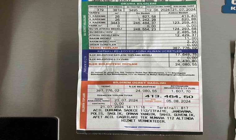 Evine gelen su faturasını görünce şok olduğunu söyleyen Merve A., "Bu ay evlendik ve evimize gelen ilk faturayı görünce çok şaşırdım. Daha önce de bu şekilde yüksek gelen fatura olduğunu bildiğim için sayacımı kontrol ettim. 387 son endeks yazmaları gerekirken 3 bin 874 son endeks yazmışlar. Bu yüzden faturamız 413 bin 464 lira geldi. TESKİ yetkililerine ulaştığım zaman sorunu çözdüler" dedi.
