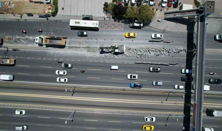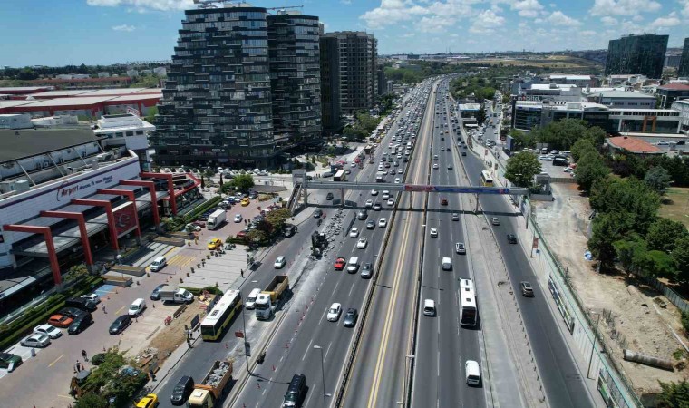 Bahçelievler Yenibosna Metrobüs İstasyonu yaya üst geçidinde yenileme çalışması nedeniyle kilometrelerce araç kuyruğu oluştu. Yaşanan trafik yoğunluğu havadan görüntülendi.
