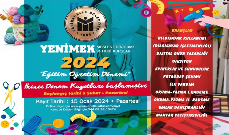 Yenimahallelilere meslek edinme ve kişisel gelişim fırsatı sunan Yenimahalle Belediyesi Meslek Edindirme ve Hobi Kursları’nda (YENİMEK) 2024 eğitim öğretim yılı ikinci dönem kurs kayıtları başladı. YENİMEK kursiyerleri 5 Şubat tarihinde ders başı yapacak.