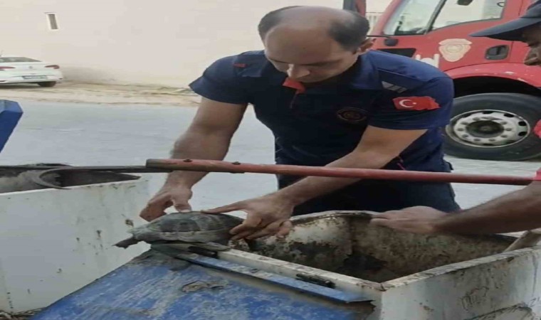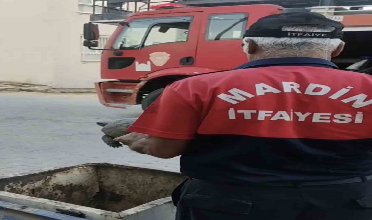 Mardin’in Mazıdağı ilçesinde yeraltı çöp konteynerine atılan kaplumbağanın imdadına itfaiye ekipleri yetişti.