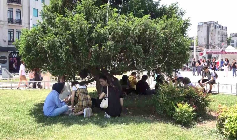 Mega kent İstanbul’un önemli noktalarından olan Taksim, sıcak havaya rağmen doldu. Taksim’e akıt eden yerli ve yabancı turistler, gölgelik yer ararken; bazıları ise güneşten şemsiye yardımı ile korundu.