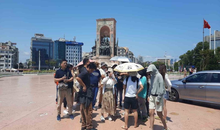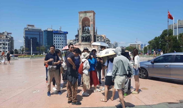 Mega kent İstanbul’un önemli noktalarından olan Taksim, sıcak havaya rağmen doldu. Taksim’e akın eden yerli ve yabancı turistler, gölgelik yer ararken, bazıları ise güneşten şemsiye yardımı ile korundu.