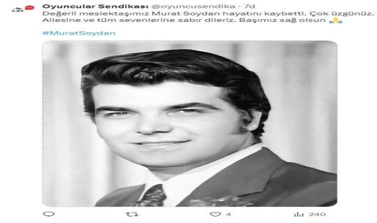 Oyuncunun eşi Uğurgül Soydan ise acısını, "Çok değerli 43 yıllık eşim Türk sinemasının kıymetli sanatçısı Murat Soydan’ı kaybettik. Ailemizin ve sevenlerinin başı sağ olsun" sözleriyle dile getirdi.