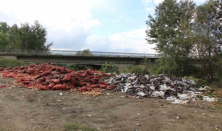 Amasya’da Yeşilırmak Nehri’nin kıyısına çürümeye yüz tutmuş çuvallar dolusu soğan ve patlıcan döküldü.