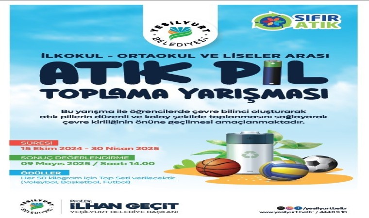 Cumhurbaşkanı Recep Tayyip Erdoğan’ın eşi Emine Erdoğan’ın himayesindeki ‘Sıfır Atık’ projelerine ülke çapında en fazla katkı sunan yerel yönetimlerin başında gelen Yeşilyurt Belediyesi, çevre bilincini arttırmak ve geri dönüşüm kültürünü yaygınlaştırmak amacıyla ilkokul, ortaokul ve liselerde ‘Atık Pil Toplama’ yarışması düzenleyecek. 15 Ekim 2024 ile 30 Nisan 2025 tarihleri arasında gerçekleşecek olan yarışma ile atık piller, çevreye zarar vermeden geri dönüşüme kazandırılmış olacak.