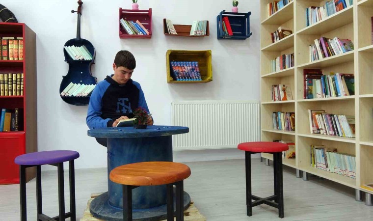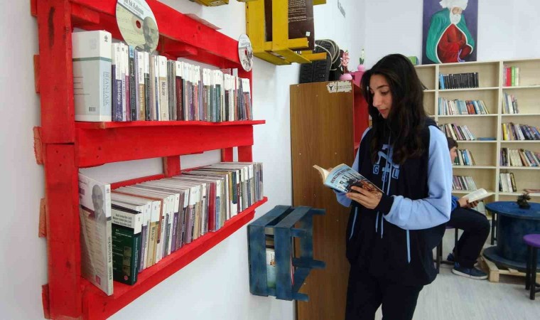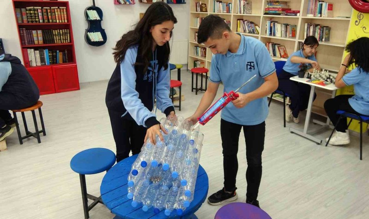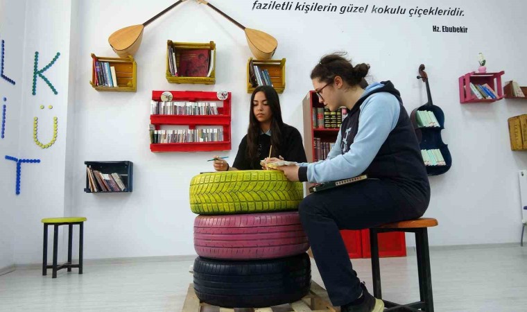 Müzik bölümü 10. sınıf öğrencilerinden Halime Nisa Doğan ise, “Kütüphanemizi arkadaşlarımız ve öğretmenlerimizle doğamıza katkı sunmak için yaptık. Pet şişeden çöp kutusu yaptık, otomobil lastiğinden masa yaptık, duvarlarımızı boyadık, kütüphanemizin kitaplarını ayarladık, burada boş zamanlarımızı değerlendiriyoruz” şeklinde konuştu.