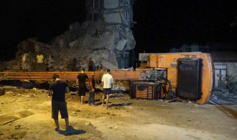 Hatay’da ağır hasarlı bina, yıkım esnasında iş makinasının üzerine çöktü. İş makinası operatörü ölümden dönerken panik anları kameraya yansıdı.