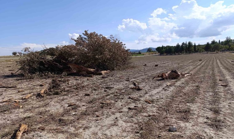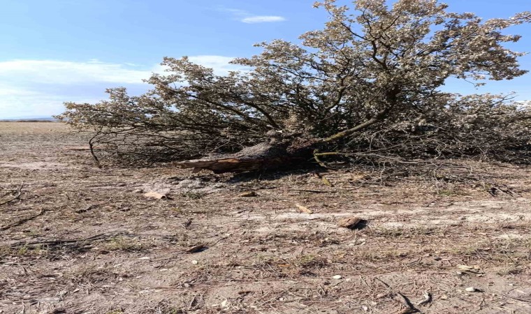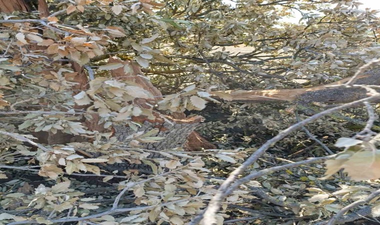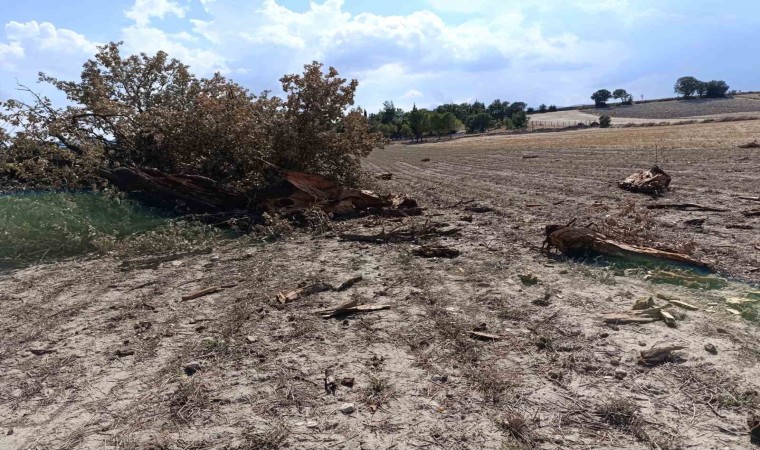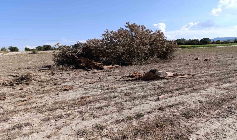 Denizli’nin Buldan ilçesinde bir araziye düşen yıldırım, asırlık meşe ağacını kökünden sökerek paramparça etti.