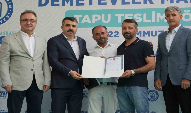 Yıldırım Belediyesi, Değirmenönü Cumalıkızık, Karapınar, Yunusemre, Sinandede, Arabayatağı, Mevlana ve Mimarsinan mahallelerinden sonra 37 hektarlık alanda gerçekleştirilen imar uygulaması neticesinde bin 237 hak sahibine resmi imar parselli tapuları teslim etti. Demetevler Spor Tesisi’nde düzenlenen tapu dağıtım törenine Yıldırım Belediye Başkanı Oktay Yılmaz’ın yanı sıra, Yıldırım İlçe Emniyet Müdürü Sakip Yalta, AK Parti İl Başkan Yardımcısı Ufuk Ay, Demetevler Mahallesi Muhtarı Ali Orhan ve hak sahibi vatandaşlar katıldı.