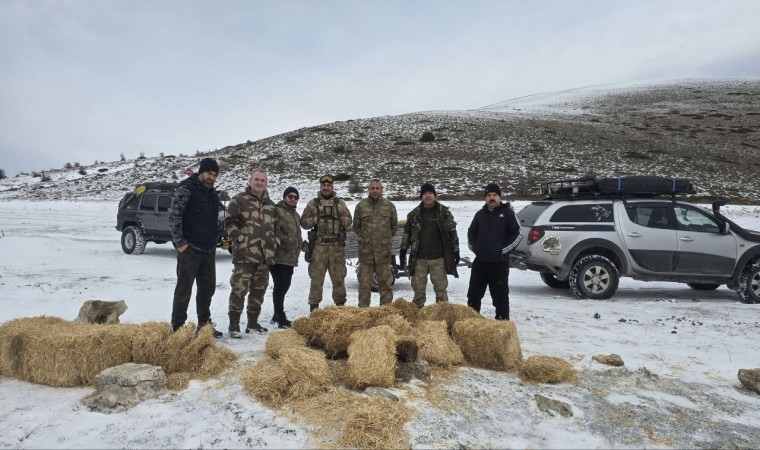 Araçlarına yükledikleri saman balyalarını zirvesi karla kaplı dağa götüren Suluova Off-Road (Sul-Off) Grubu üyeleri, sürü halindeki atların görüldüğü alanda dağıtarak beslenmelerini sağladılar.