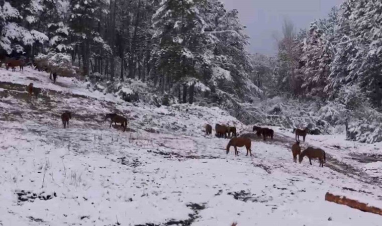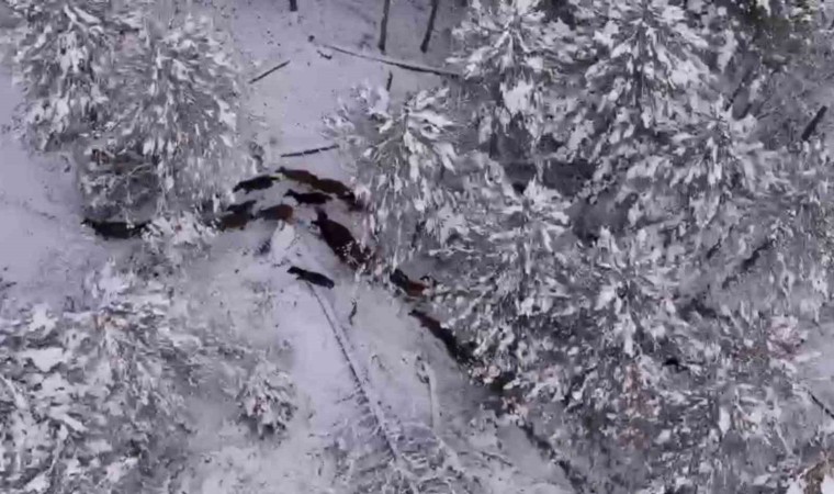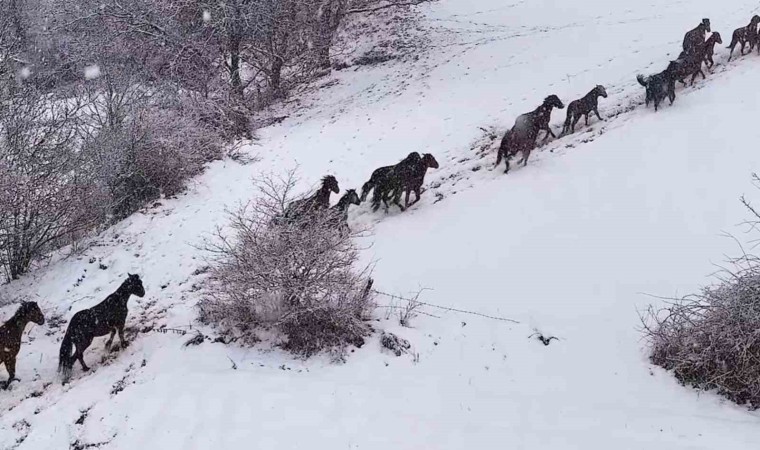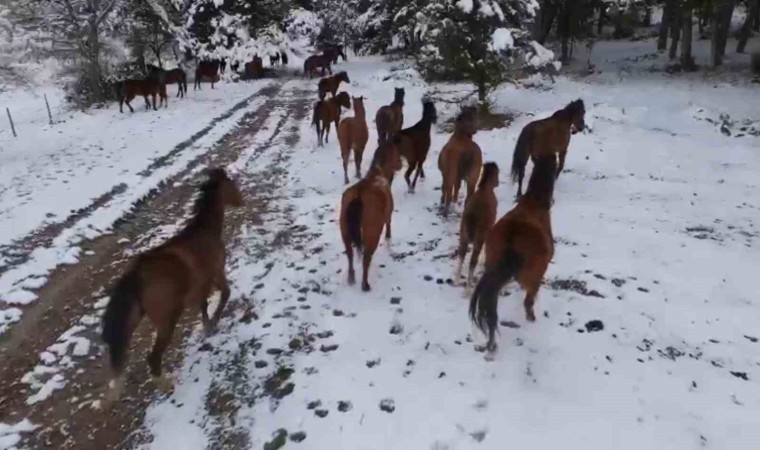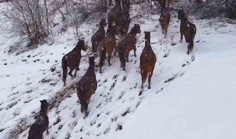 Yüzde 65’i ormanlarla kaplı Bolu’da yılkı atlarının yaşam alanı olan At Yaylası, beyaz örtüyle kaplandı. Kent merkezine 10 kilometre uzaklıkta bulunan 1150-1250 metre rakımda yer alan ve 7 yayladan oluşan At Yaylası’nda kış güzelliği yaşanıyor. At Yaylası’na ismini veren vahşi yılkı atları doğasever vatandaş Gökhan Bilen tarafından dron ile görüntülendi. Onlarca yılkı atının muhteşem görüntüleri ve sürü halinde etrafta dolaşması güzel görüntüler ortaya çıkardı.