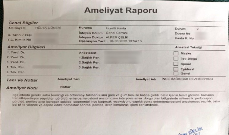 3 yıl süreyle meslekten geçici olarak men edilen Alper Çelik hakkında şikayetçi olan Hülya Güneri, operasyonlar sonucu iç organlardan 400, dışardan ise 18 dikiş atıldığını söyledi.