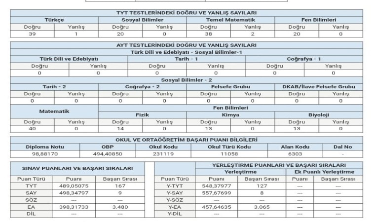 ÖSYM tarafından bu yıl gerçekleştirilen YKS sonuçlarına göre Kaya Karakaya Fen Lisesinde eğitim gören Muhammet Talha Özer, AYT’de Türkiye 8’incisi oldu. Başarılı öğrenci, Türkçede 39 doğru 1 yanlış, sosyal bilimlerde 20 doğru 0 yanlış, temel matematikte 38 doğru 2 yanlış ve fen bilimlerinde 20 doğru 0 yanlış yaparak büyük başarı elde etti.