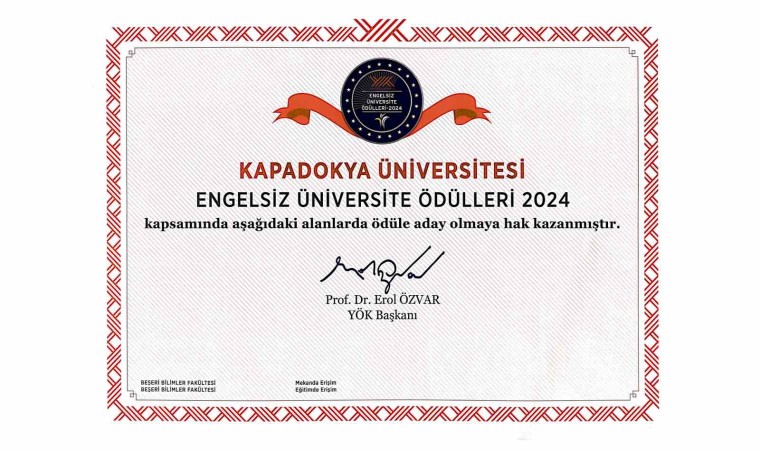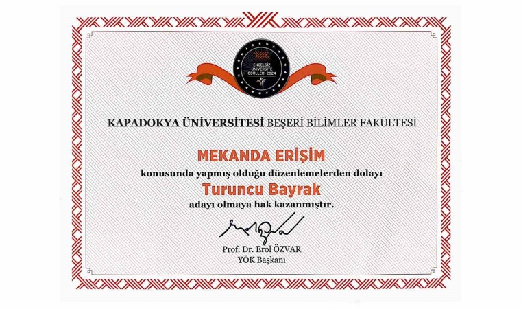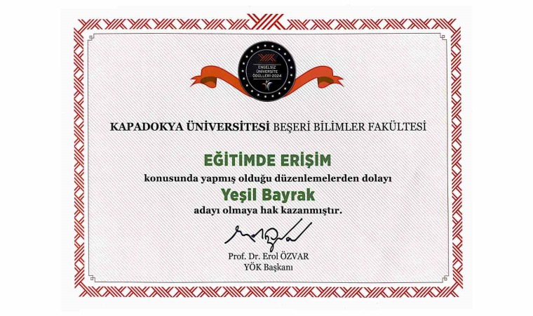 Kapadokya Üniversitesi (KÜN), ’Eğitimde Erişim’ konusunda yapmış olduğu düzenlemelerden dolayı Yeşil Bayrak adayı olmaya, ’Mekânda Erişim’ konusunda yapmış olduğu düzenlemelerden dolayı Turuncu Bayrak ödülü kazandı. Bu yıl Engelsiz Üniversite Ödülleri için 112 üniversiteden toplam 1709 başvuru yapıldı. 48 panelist tarafından yapılan değerlendirme sonuçlarına göre, 76 üniversite toplam 319 bayrak alma hakkı elde etti.
