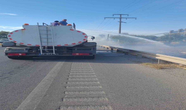 Ayvalık’ta, Çanakkale ile İzmir’i birbirine bağlayan E-87 karayolunun kenarında yanar halde atılan sigara izmaritinin kurumuş otları tutuşturmasıyla başlayan yangın, tesadüfen oradan geçmekte olan Ayvalık Belediyesi bünyesindeki Park Bahçeler Müdürlüğü ekiplerinin, hemen su tankerinin vanalarını açarak müdahalesiyle söndürüldü.