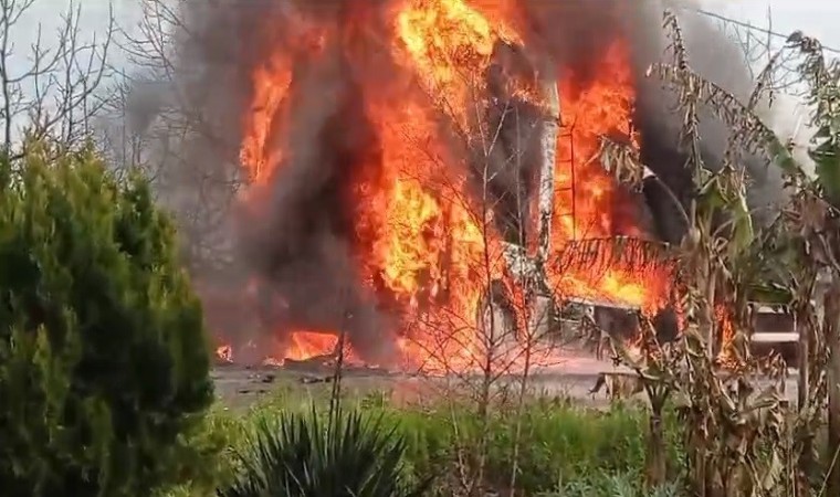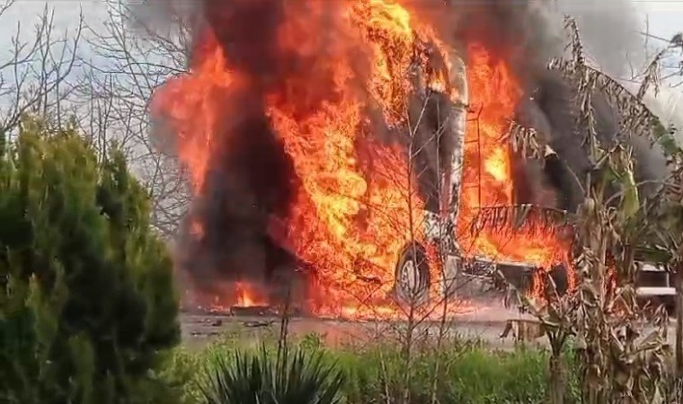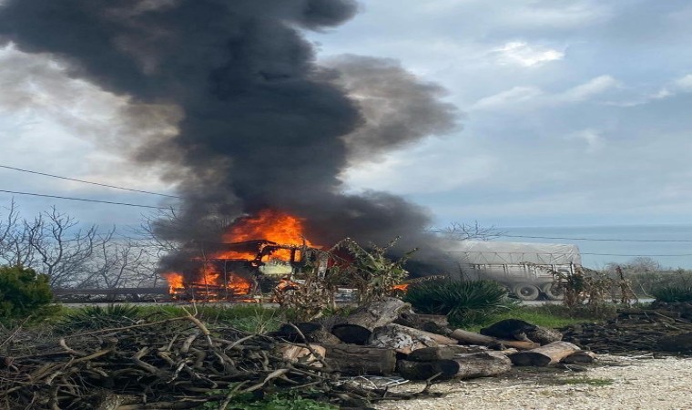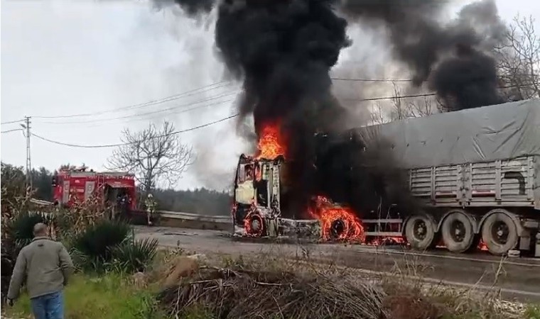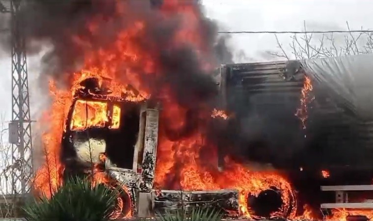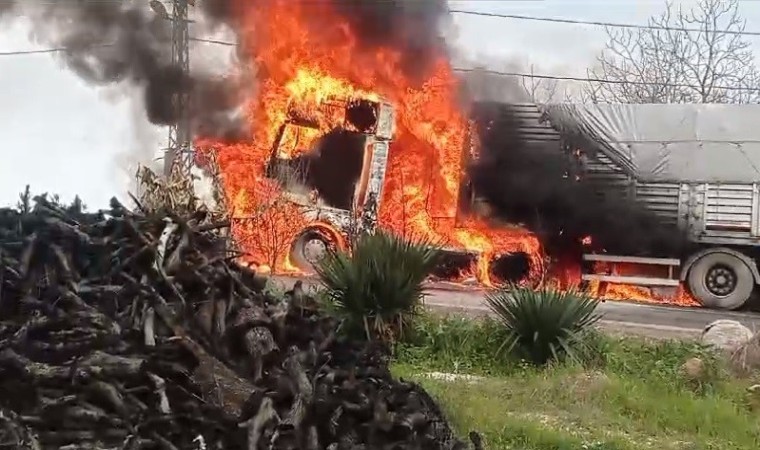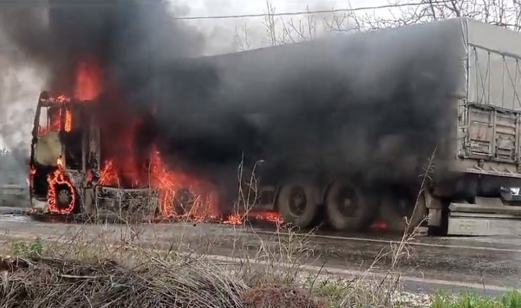 Bursa’nın İznik ilçesinde arıza yapınca sürücüsünün yol kenarına bırakıp tamirci aramaya gittiği tır alev alev yandı.