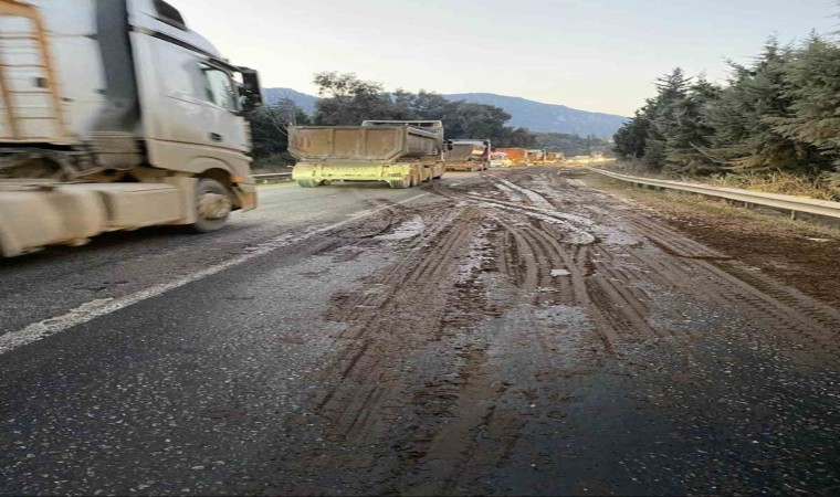 Hatay’da seyir halindeki araçlardan yola dökülen ve kaza tehlikesi oluşturan zeytin posası, karayolları ekipleri tarafından temizlendi.