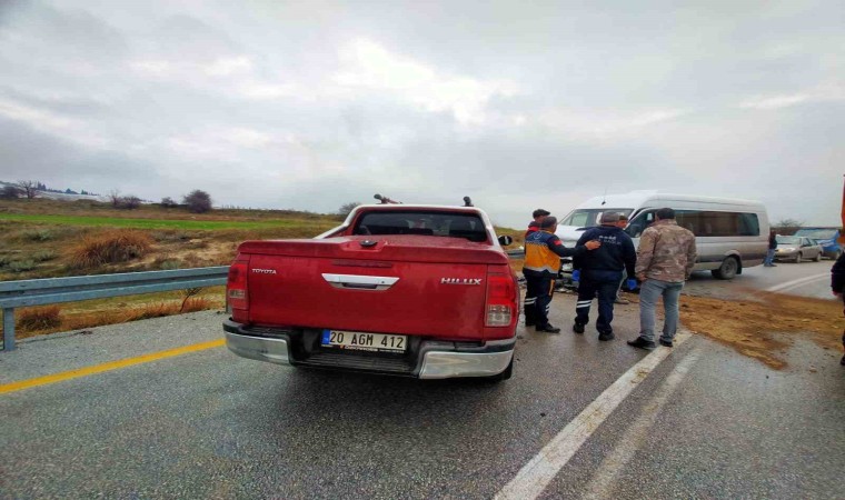 Kaza, Denizli’nin Pamukkale ilçesine Karahayıt Mahallesi’nde meydana geldi. Edinilen bilgilere göre, Karahayıt istikametinden Pamukkale’ye giden C.Ç. kontrolündeki 20 AGM 412 plakalı Totoya marka pickup, kaygan zemin sebebiyle sürücüsünün direksiyon hakimiyetini kaybetmesi sonucu kontrolden çıktı. Yolda savrulan pickup, Pamukkale istikametinden Karahayıt’a gelen F. C. kontrolündeki 20 GM 708 plakalı yolcu minibüsüyle kafa kafaya çarpıştı. Kazada çarpışmanın şiddetiyle her iki araçta bulunan 5 kişi yaralandı.