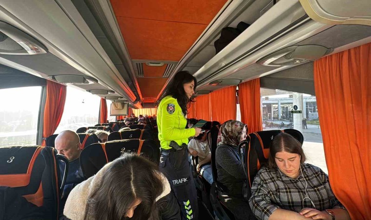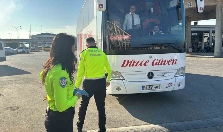 Düzce’de trafik polisleri yolcuların güvenliği için otobüslere yönelik denetimlerine devam ediyor.
