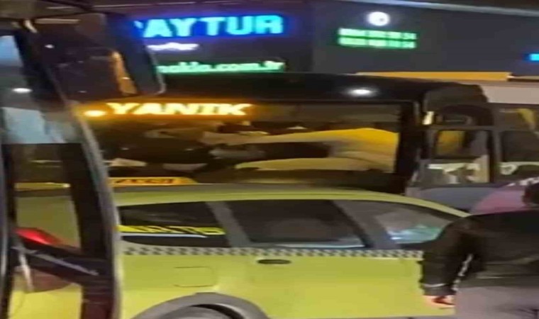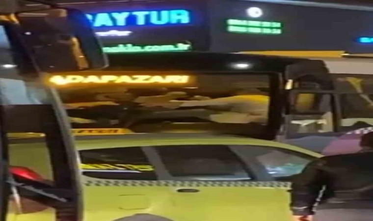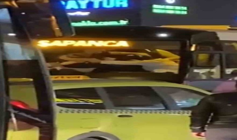 Sakarya’nın Sapanca ilçesinde yolcu otobüsü içerisinde 2 kişinin tekme tokat birbirine girdiği anlar cep telefonu kamerasına yansıdı. Şoför oldukları öğrenilen şahısların kavgası çevredekilerin araya girmesiyle son buldu.