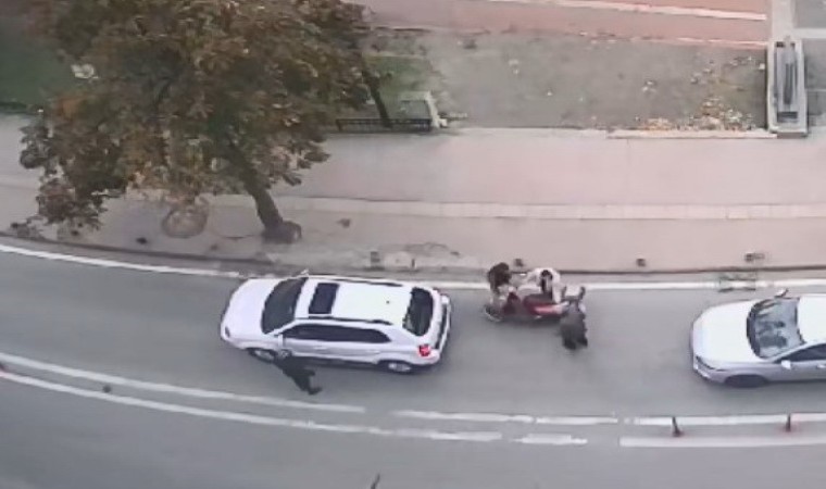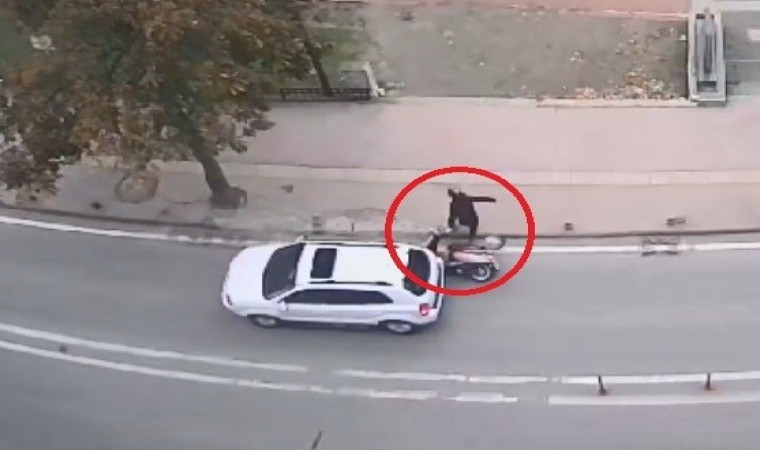 Motosiklet sürücüsü yaptığı hızlı refleksle aracın altında kalmaktan son anda kurtuldu. Olay anı ise bir iş yerinin güvenlik kamerasına anbean yansıdı.