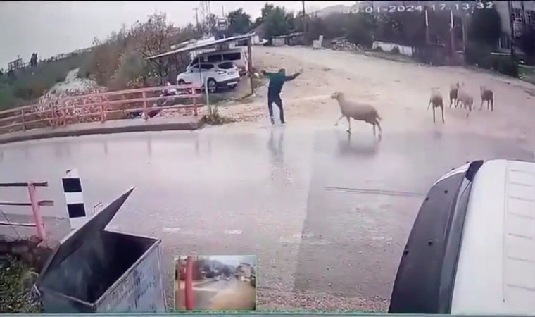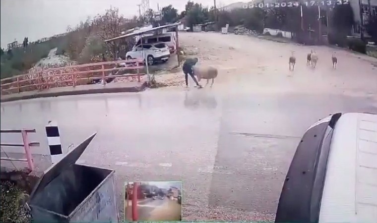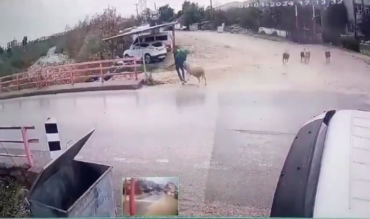 Olay, Antalya’nın Finike ilçesine bağlı Turunçova Mahallesi’nde dün akşam saatlerinde yaşandı. Edinilen bilgiye göre, bir vatandaş yolun karşısına geçmek istediği esnada yanında dört tane koyun bulunan koçun saldırısına uğradı. Saldırıya uğrayan adam, kaçmaya fırsat bulamadan aldığı darbeyle refüje yuvarlandı. Neye uğradığını anlamayan adam toparlanıp ayağa kalktı ve yoluna devam etti. Henüz birkaç adım attığı sırada ise bölgeden uzaklaşan koç, bir anda yeniden ortaya çıkıp adama doğru koşmaya başladı. Koçu gören adam saldırıdan kurtulmak için yerden aldığı taşları koça atmaya başladı. Korkan koç yanındaki koyunlarla birlikte yolun karşısına kaçarken, yolun kenarında olayı izleyen gençler de kaçarak uzaklaştı. O anlar ise çevrede bulunan bir işyerinin güvenlik kamerası tarafından kaydedildi.