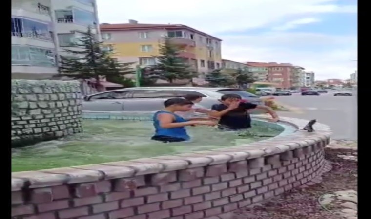 Yozgat’ta sıcaktan bunalan çocuklar, ışıklandırma ve fıskiyelerden kaynaklanabilecek tehlikeye aldırış etmeden girdikleri süs havuzunda serinlemeye çalıştı.