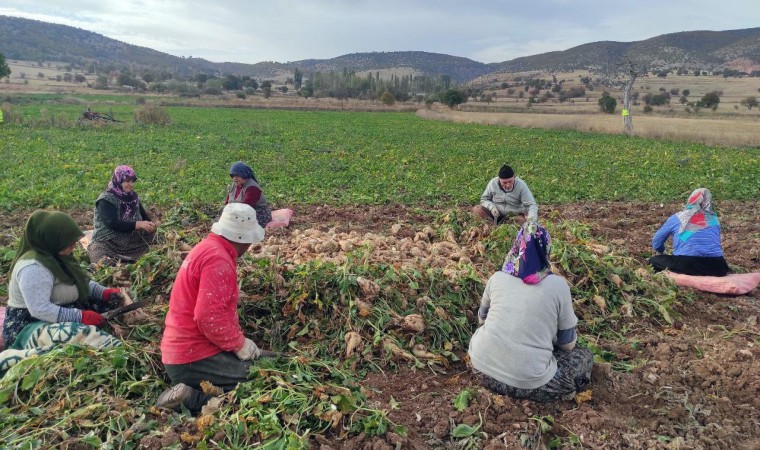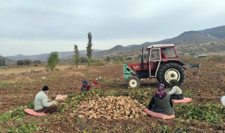 Yozgat’ın Çekerek ilçesine bağlı Özüveran köyünde şeker pancarı üreticisi, geleneksel yöntemlerle imece usulü hasat yapıyor.