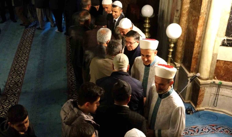 Namazdan sonra okunan hutbe ve duaların ardından cami cemaati, saf halinde sıralanıp bir biriyle bayramlaştı.