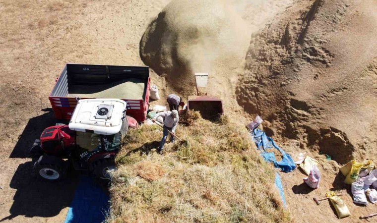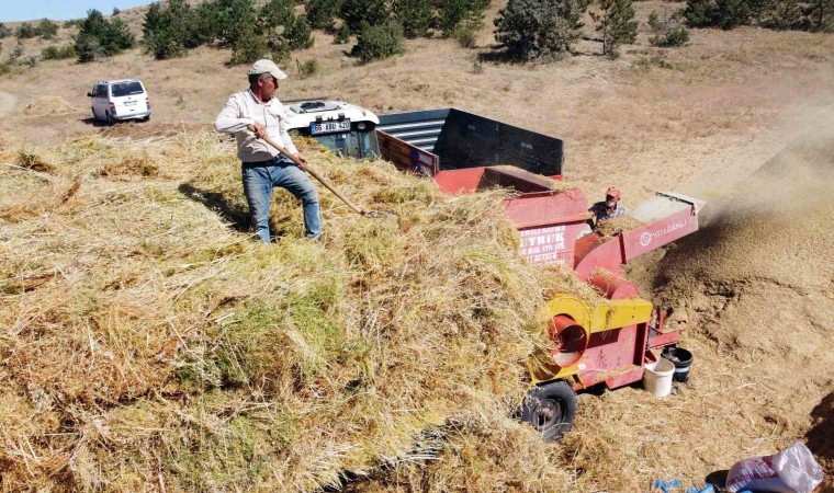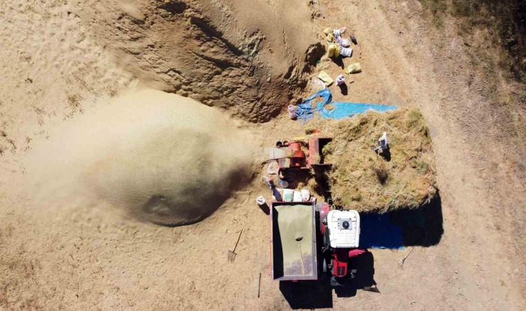 Türkiye’de yeşil mercimek üretiminde birinci sırada yer alan Yozgat’ta tarladaki ürünleri toplayan çiftçiler, diğer taraftan da topladıkları mercimeği patoza atarak saman ve ürünü ayırıyor.