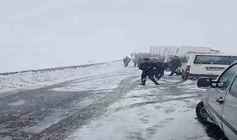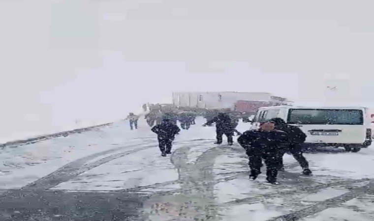 Hakkari’nin Yüksekova-Şemdinli kara yolunda yoğun tipiden dolayı çok sayıda araç mahsur kalırken ekiplerin yol açma çalışmaları aralıksız devam ediyor.