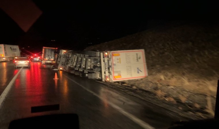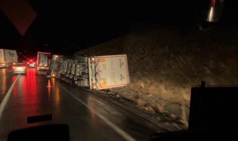 Hakkari’de karla karışık yağmur ve yoğun sisin etkili olduğu Yüksekova-Van karayolunda bir tır yan yattı.