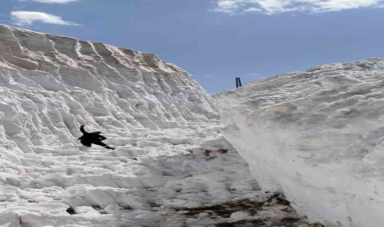 Haziran ayına rağmen tünelleri andıran karlı yolları görenler hayretler içerisinde kalırken, bir yandan da hatıra fotoğrafı çektiriyor.