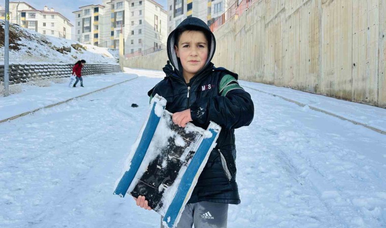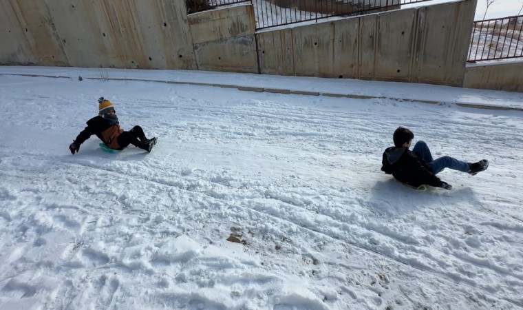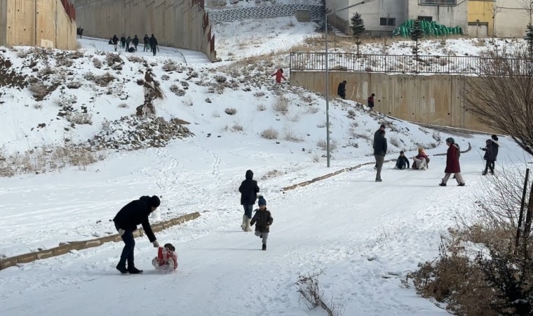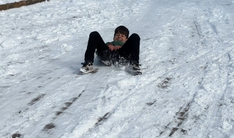 Hakkari’nin Yüksekova ilçesinde çocuklar, evlerinden getirdikleri poşet, tahta, tepsi ve bidonlarla kaymanın keyfini çıkardı.