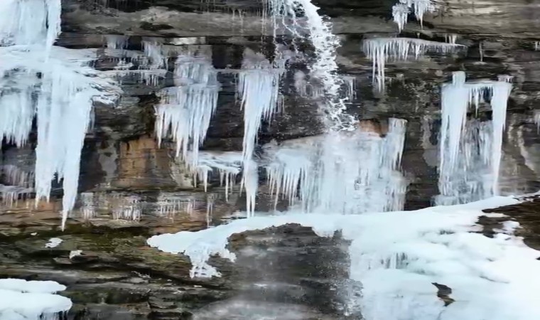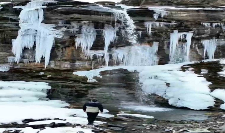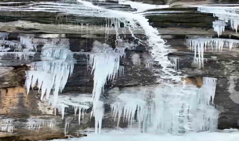Hakkari’nin Yüksekova ilçesinde soğuk havanın etkisiyle donan şelale hayran bırakırken, oluşan buz sarkıtlarının boyu ise 4 metreyi buldu.