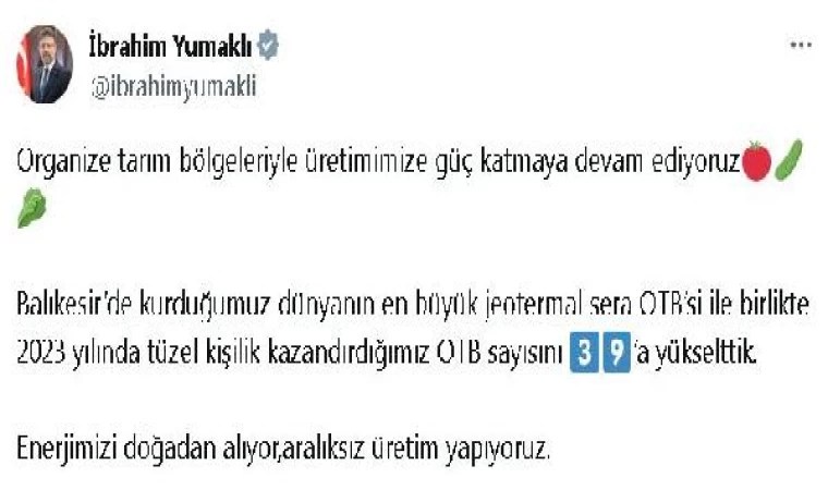 Bakan Yumaklı, sosyal medya hesabından yaptığı açıklamada, "Organize tarım bölgeleriyle üretimimize güç katmaya devam ediyoruz. Balıkesir'de kurduğumuz dünyanın en büyük jeotermal sera OTB'si ile birlikte 2023 yılında tüzel kişilik kazandırdığımız OTB sayısını 39'a yükselttik. Enerjimizi doğadan alıyor, aralıksız üretim yapıyoruz" dedi.