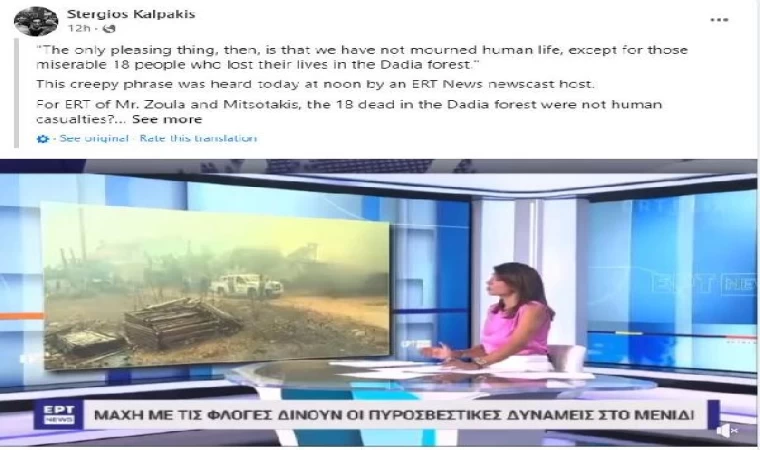 Vahdet AYAZ, (DHA)- Yunanistan Devlet Televizyonu (ERT) spikeri Alexandras Douvara’nın, orman yangınlarına ilişkin sunduğu haberde, “Tek sevindirici şey, Dadia Ormanı’nda hayatını kaybeden 18 kişi dışında insan hayatının yasını tutmamış olmamızdır” ifadelerini kullanması tepki çekti.