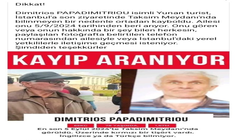 Edinilen bilgiye göre Dimitrios Papadimitriou (78) isimli Yunan turist 5 Eylül’de Taksim’de gezerken bilinmeyen bir nedenle ortadan kayboldu. Yunan turistin ortadan kaybolduğunu fark eden ailesi arama çalışması başlatarak durumu Yunan Başkonsolosluğuna haber verdi. Bunun üzerine çalışmalar derinleştirildi. Aramalar kapsamında kayıp ilanları hazırlandı. Polis ekipleri de çalışmalara katıldı. 8 gün aradan sonra yaşlı adam Beyoğlu Cihangir’de polis ekipleri tarafından gezerken bulundu. Sağlık durumunun iyi olduğu öğrenilen adam, Yunan Başkonsolosluğuna götürüldü.