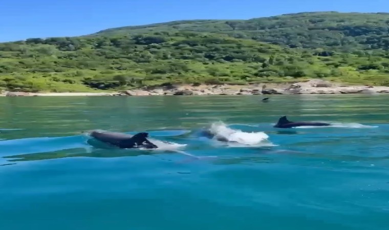 Kastamonu’nun Cide ilçesinde balıkçı teknesinin önünde seyreden yunus sürüsü görsel şölen oluşturdu. Yunusların tekneye “kılavuz kaptanlık” yaptığı anlar cep telefonu kamerasıyla kaydedildi.