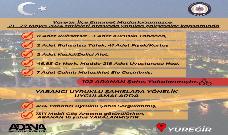 Adana Emniyet Müdürlüğü Yüreğir İlçe Emniyet Müdürlüğüne bağlı, devriye ve araştırma ekipleri vatandaşların güvenliği için çalışmalarına hız kesmeden devam ediyor. Bu çerçevede ekiplerin yaptığı uygulamalarda, 8 ruhsatsız tabanca, 3 kuru sıkı tabanca, 2 uzun namlulu ruhsatsız tüfek ve bu silahlara ait 41 fişek ele geçirilirken aynı zamanda 2 kesici alet de ele geçirildi. Öte yandan yapılan asayiş uygulamalarıyla 46,85 gram uyuşturucu madde, 218 uyuşturucu hap ele geçirildi. Yapılan uygulamalarda uyuşturucu maddenin yanı sıra çalıntı 7 motosiklette ele geçirildi. Aynı zamanda Yüreğir polisi çeşitli suçlardan aranan 102 şüpheliyi yakalarken yabancı uyruklu kişilere yönelik uygulamalarında ise 494 yabancı uyruklu kişiyi sorgularken 131’ni mobil göç aracına gönderdi.