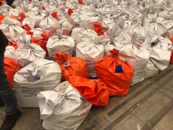 Yurtdışı İlçe Seçim Kurulu Başkanı Ali Uğuz, 72 ülke, 151 temsilcilikte 5 bin 114 sandıkta oyların kullanıldığını belirterek, "Bu sandıklarda yurt dışında yaşayan vatandaşlarımız 9 Mayıs’a kadar oylarını kullandılar. Bu oylar toplanarak diplomatik torbalar ve komisyonlarla kiralanan 3 THY uçağı ile kargo şeklinde önceki gün geldi. Dün sabah kargoları boşalttık. Daha sonra benim ve 4 siyasi partinin temsilcileri ile asma kilitle kilitledik. Diplomatik torbaları sandıklara göre tasnif edeceğiz, akşam 17.00'de kapatacağız. 14 Mayıs'ta gelip kilitleri açacağız ve torbaları sandık sayım masalarına yerleştireceğiz ve sayıma başlayacağız" diye konuştu.