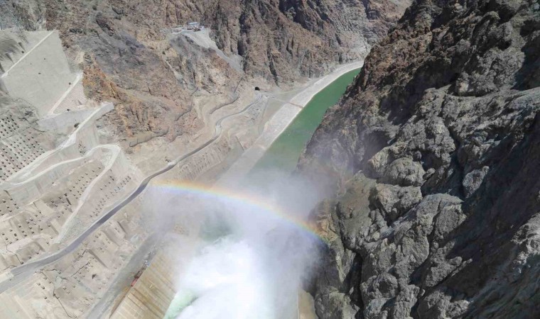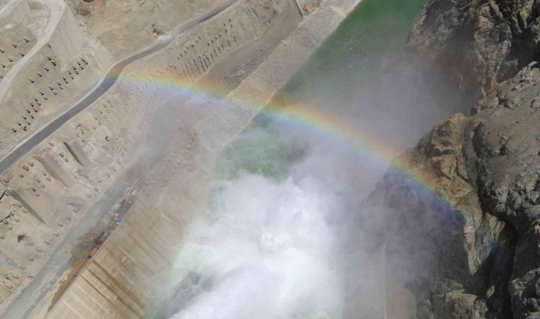 Artvin’de elektrik üretimine hazırlanan Yusufeli Barajı’nda kapaklar açılınca güneşli havada oluşan gökkuşağı eşsiz görüntüler ortaya koydu.