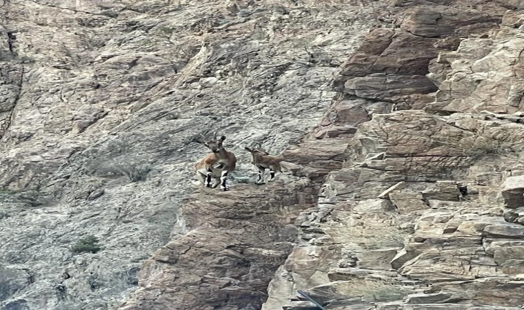 Adeta yer çekimine meydan okuyan yaban keçileri sürü halinde geziyor. Su ve taşlardan tuz ihtiyaçlarını gidermek için sürüler halinde bu tehlikeyi göze alan keçilerin zorlu yolculuğu görüntülenirken, insanlardan kaçmamaları dikkat çekiyor.