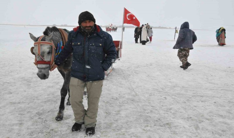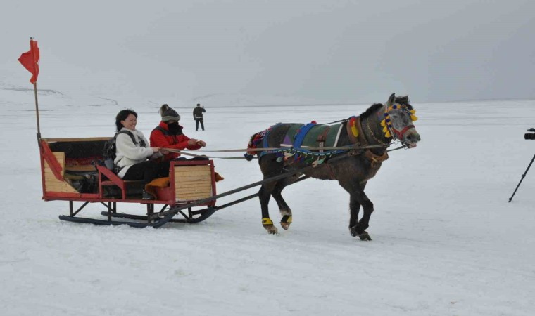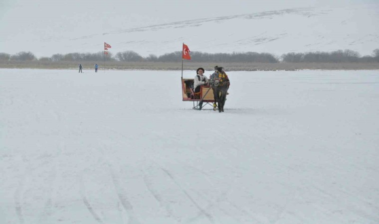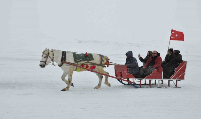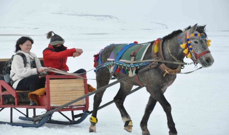 Kars’a gelen vatandaşların yüzeyi tamamen buzla kaplı Çıldır Gölü’nde atlı kızak heyecanı devam ediyor.