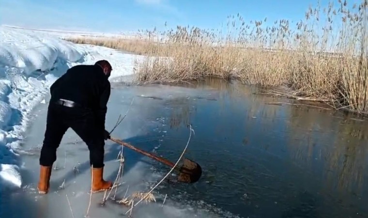 Ağrı’nın Tutak ilçesi Geçimli köyünde vatandaşlar, dondurucu soğuklara rağmen yanlarında getirdikleri kazma, küreklerle donan derede buzu kırarak balık avlamanın keyfini çıkarıyor.