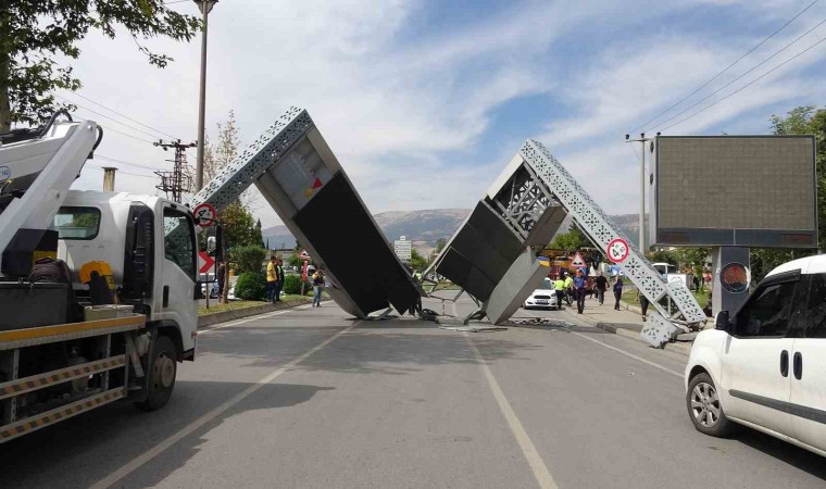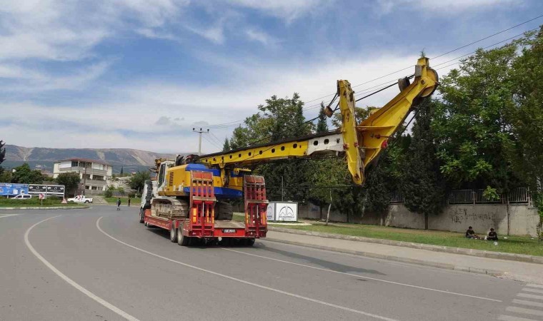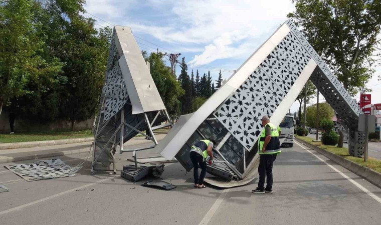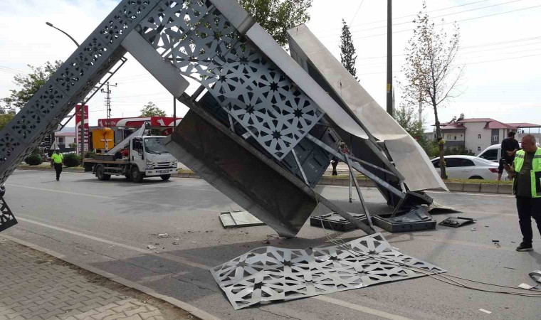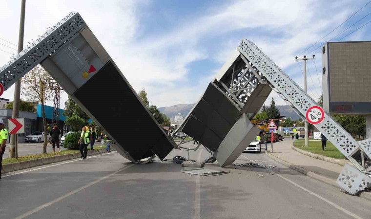 Kahramanmaraş’ta yüzlerce aracın geçtiği yolda ekskavatör taşıyan vinç sürücüsü yön tabelasını devirdi.
