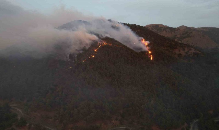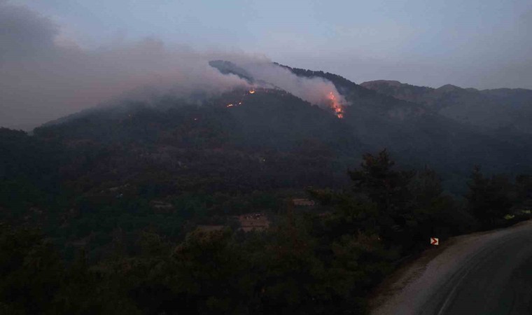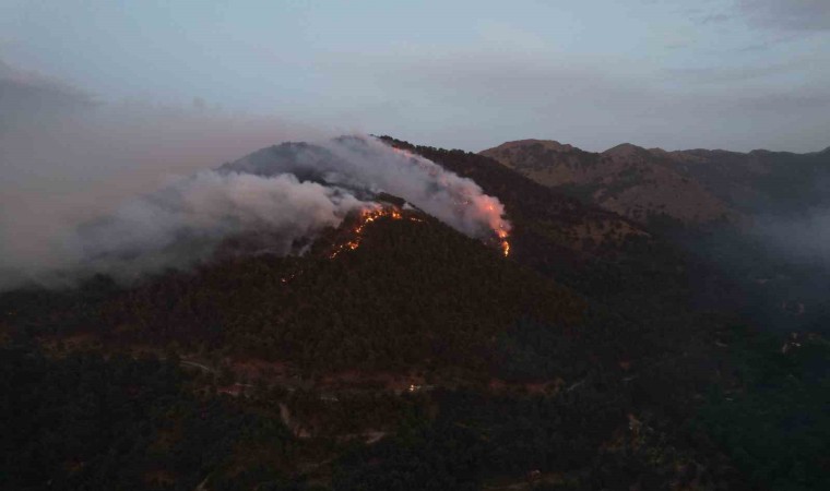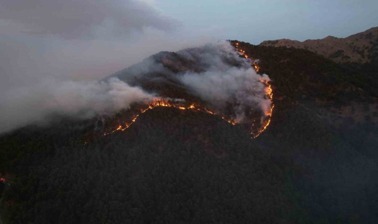 Denizli’nin Babadağ ilçesinde yaklaşık 10 saattir devam eden ve yüzlerce kişiyi evinden eden orman yangını havadan görüntülendi.