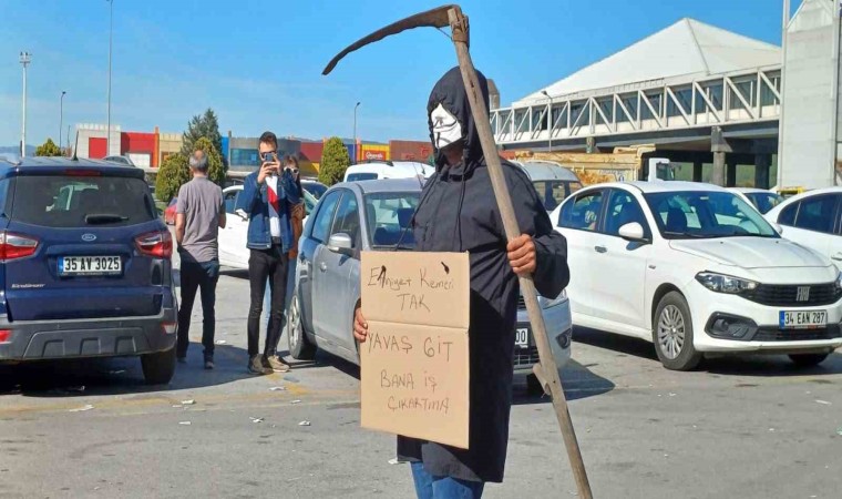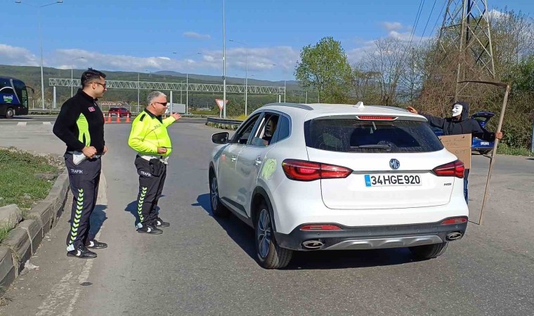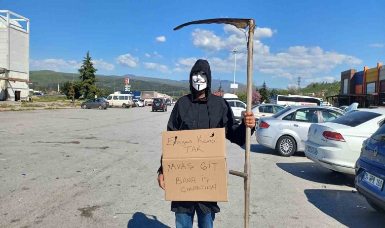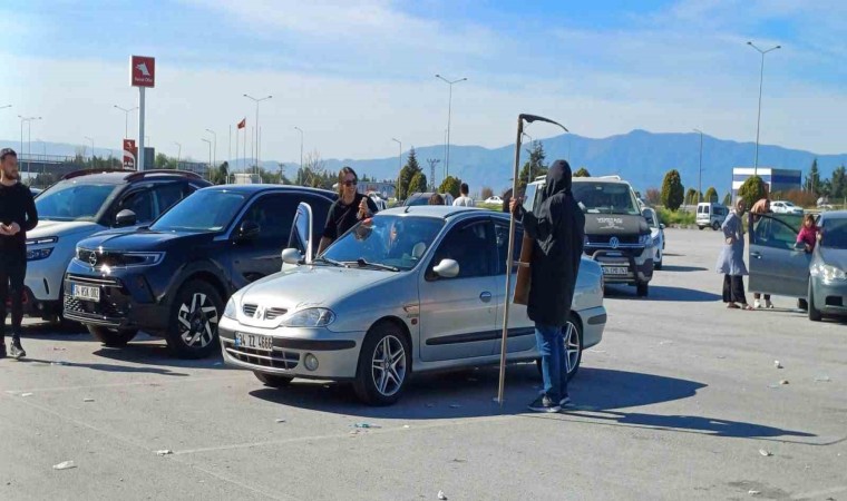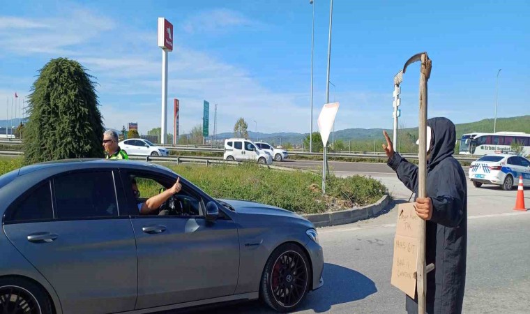 Trafik yoğunluğunda acı olayların yaşanmasını istemeyen motokurye Resul Gür ise ilginç bir çalışmaya imza attı. Yüzüne maske takıp, eline tırpan alan Gür, boynuna da "Emniyet kemerini tak, yavaş git" yazılı pankart asarak, sürücüleri uyardı. Genci gören vatandaşlar ise cep telefonlarının kameralarıyla o anları kayda aldı.